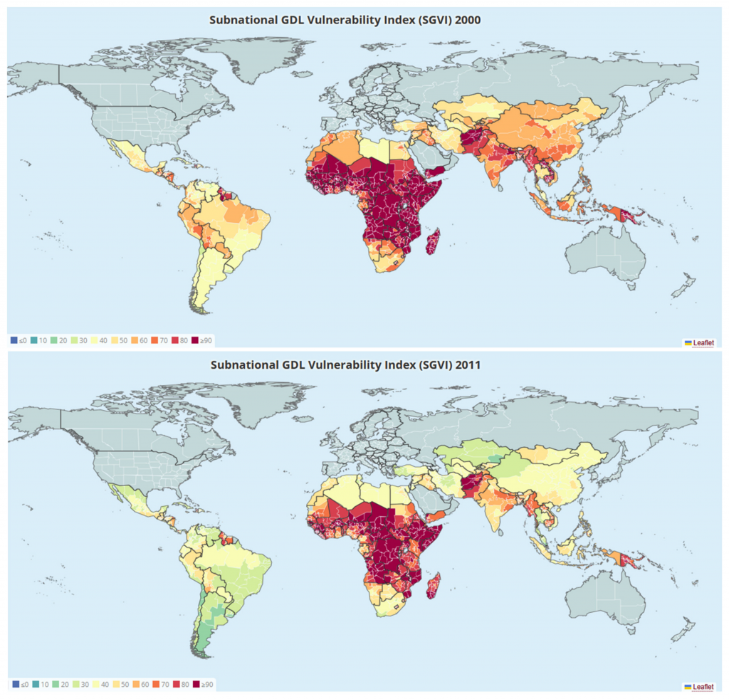 The Subnational Vulnerability Index (SGVI) is a data-driven measure designed to monitor the human dimensions of vulnerability to climate change and natural disasters. It is described in a paper titled “From National Averages to Local Realities: A Subnational Vulnerability Index to Guide Sustainable Development in Low- and Middle-Income Countries” developed by Jeroen Smits and Janine Huisman. Unlike traditional indices that focus only on national averages, the SGVI reveals localized disparities in coping and adaptive capacity which are often obscured by country-level statistics. The data covers 1,260 regions across 118 countries, providing a resolution ten times more detailed than previously available.